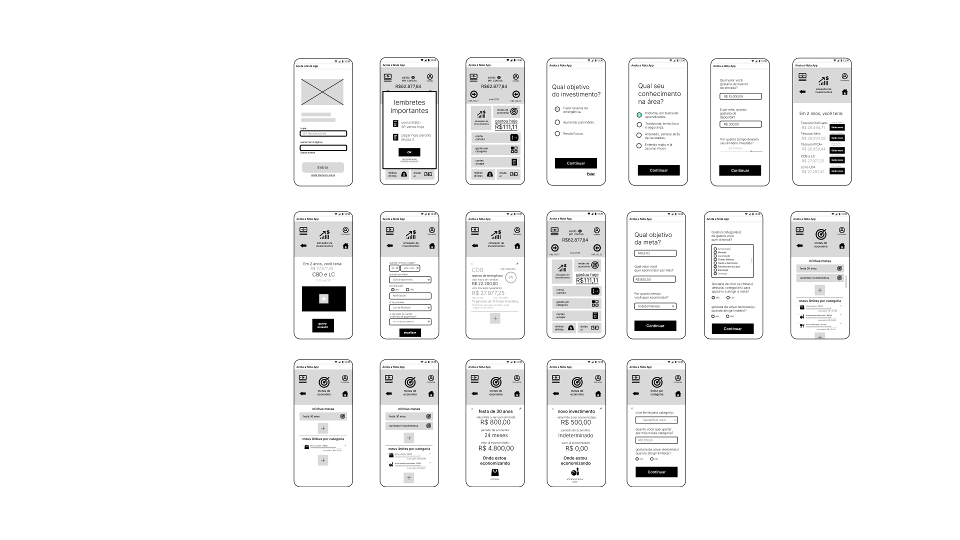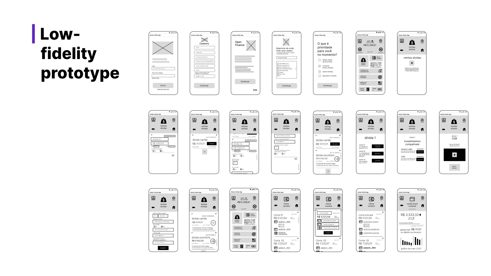 At this stage, the brainstorm served to generate as many ideas as possible from all group participants, without initial judgments. As well as sketches/wireframes of screens. Here it has already been decided that it will be a financial control app.