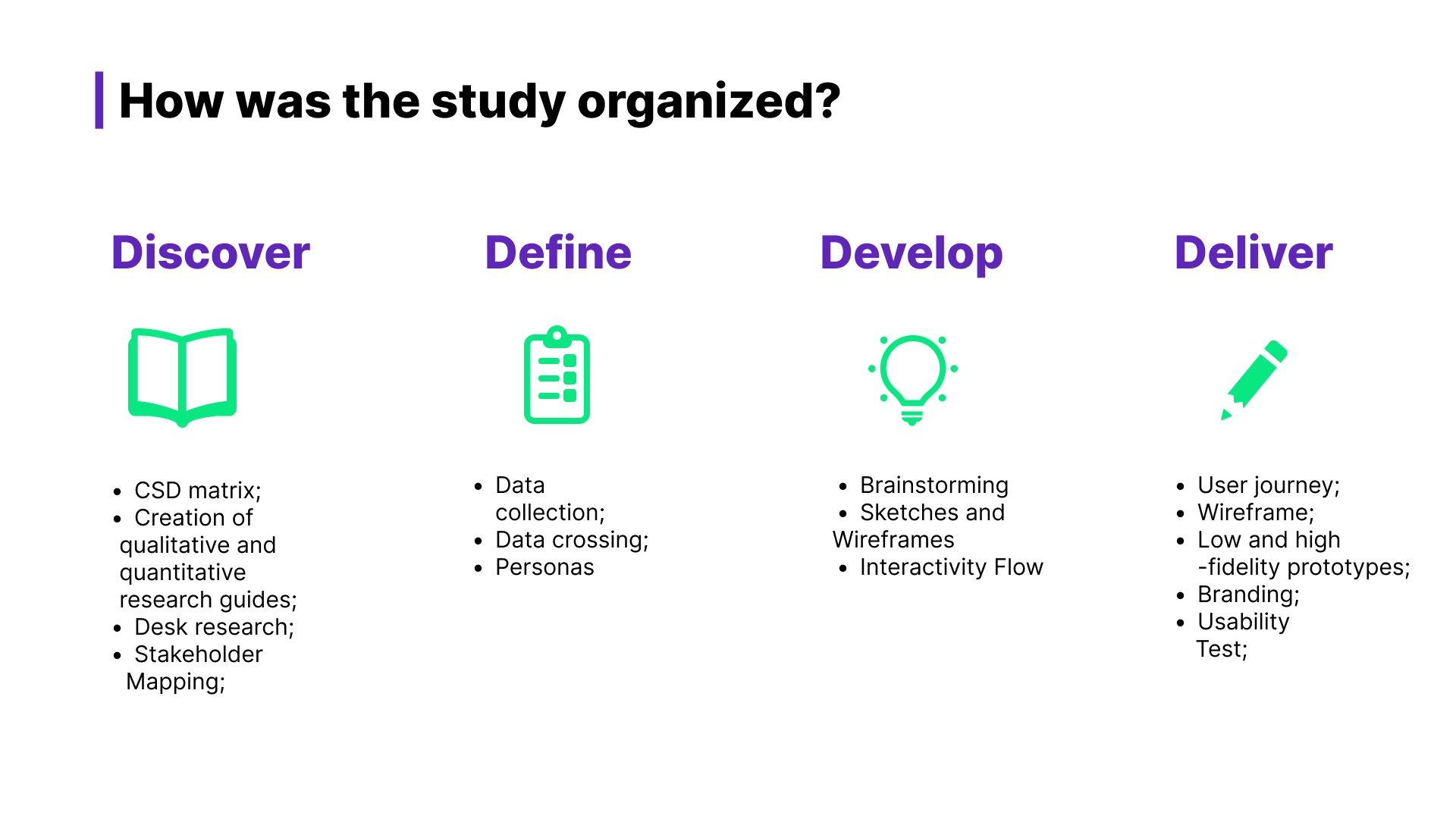 Employ the Double Diamond methodology, focusing on all stages of the project construction process.