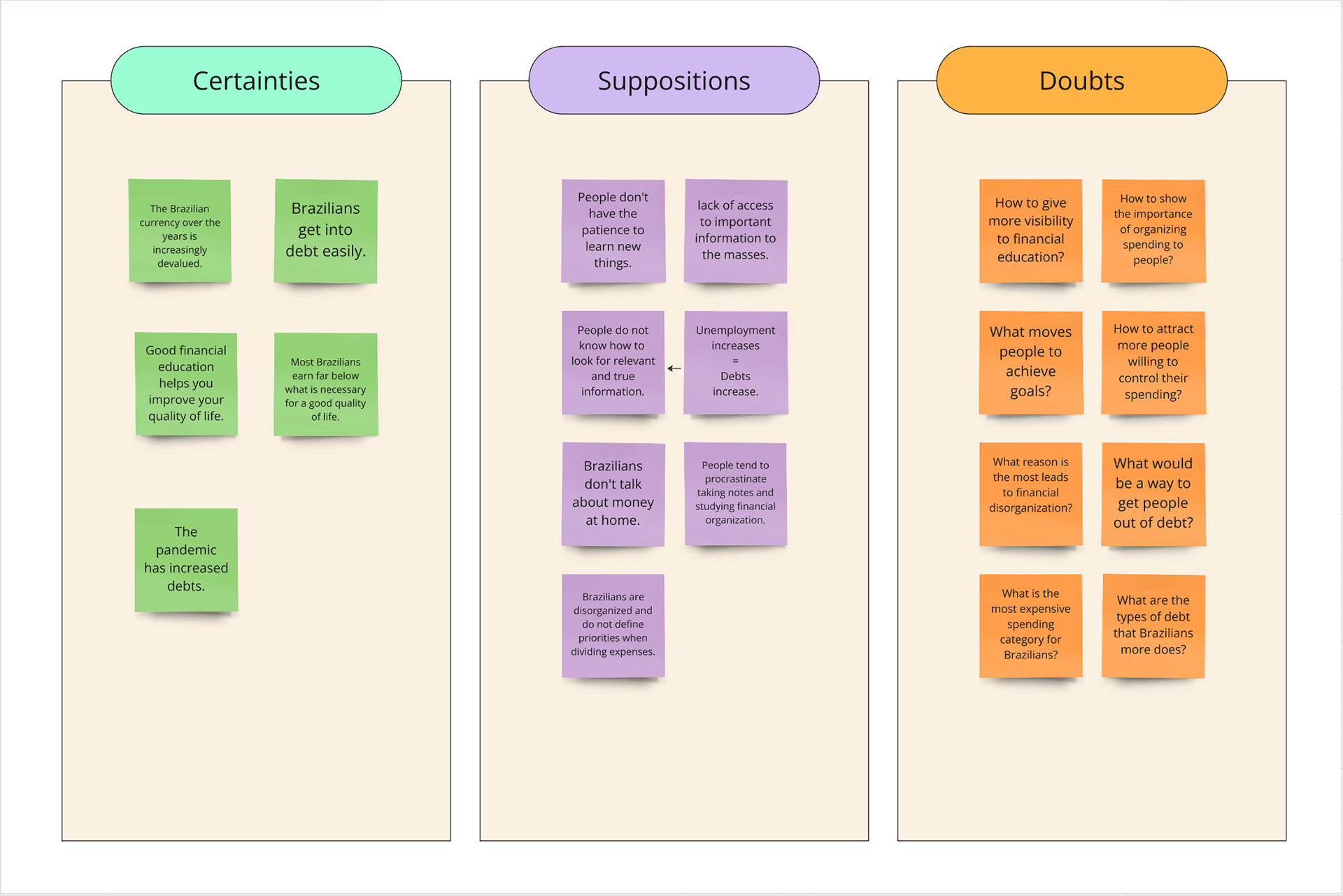 Here it was time to understand what was known about the problem: The certainties, assumptions and doubts that came to mind.